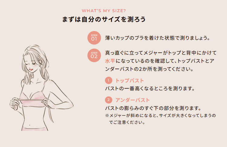 真っ直ぐに立ってメジャーがトップと背中にかけて水平になっているのを確認して、トップバストとアンダーバストの2か所を測ってください。